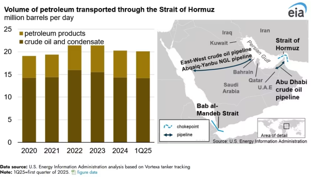 伊朗也有能力阻断通过霍尔木兹海峡的石油运输。根据EIA的数据,2024年通过该海峡的石油流量平均为每天2000万桶,约占全球液体石油消费量的20%。