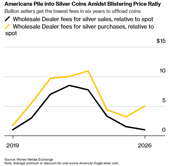 该贵金属经销商目前对零售买家购买一盎司美国鹰银币的报价,在现货价格上高出12美元,这是自2023年以来的最高溢价。而卖家则需要向该在线交易所支付5至8美元的费用来出售白银,这是有史以来最高的美元金额费用。