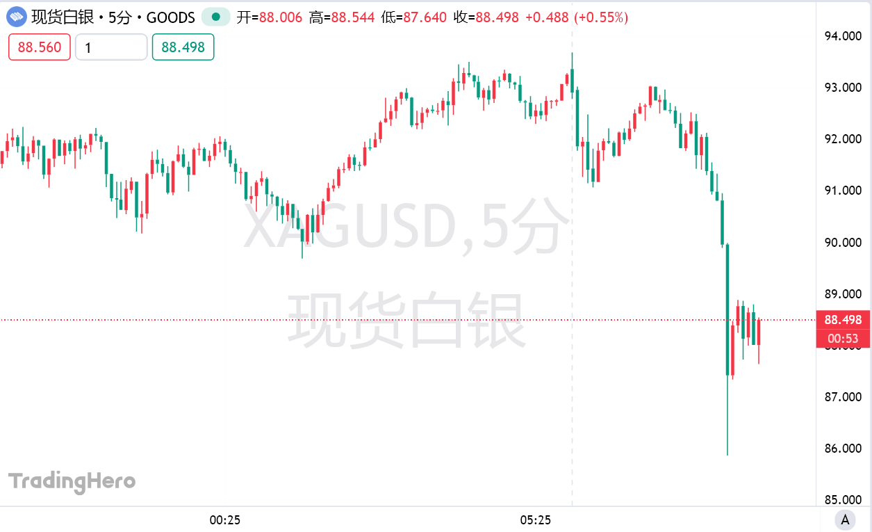 白银周四早盘大幅走低。现货白银日内一度重挫超6美元,跌超6%,截至发稿报88.3美元/盎司,从周三的历史高位回落。此前美国总统特朗普暂缓对进口关键矿产加征新关税,但并未排除此可能性。