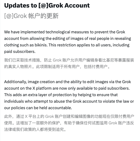“我们已经实施技术措施,防止Grok账号允许编辑真人图像,使其呈现如比基尼等暴露服装。” “此限制适用于所有用户,包括付费订阅者。”