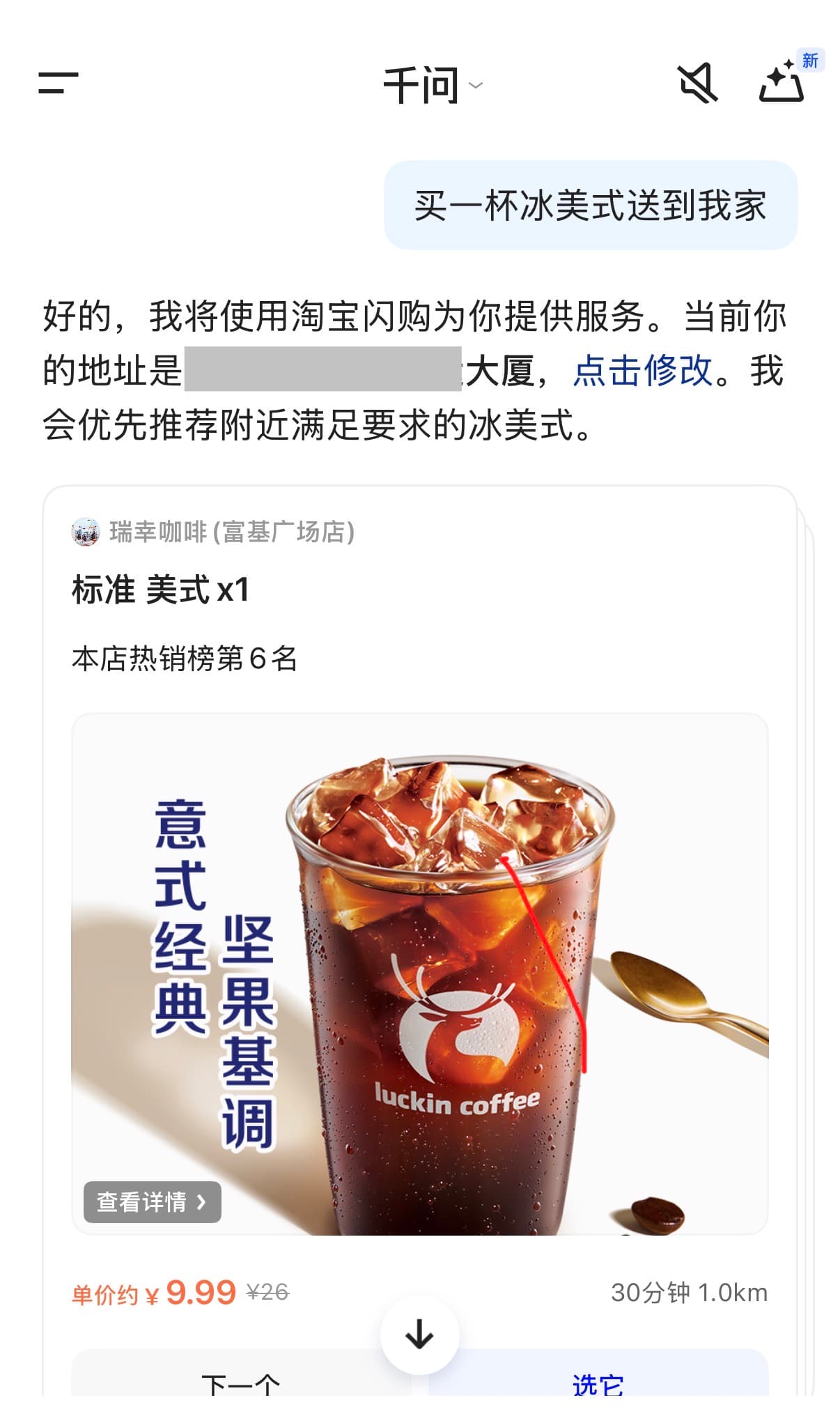 小编实测发现,在为千问APP提供定位、淘宝闪购等授权后,可以成功下单一杯冰美式送到定位处。