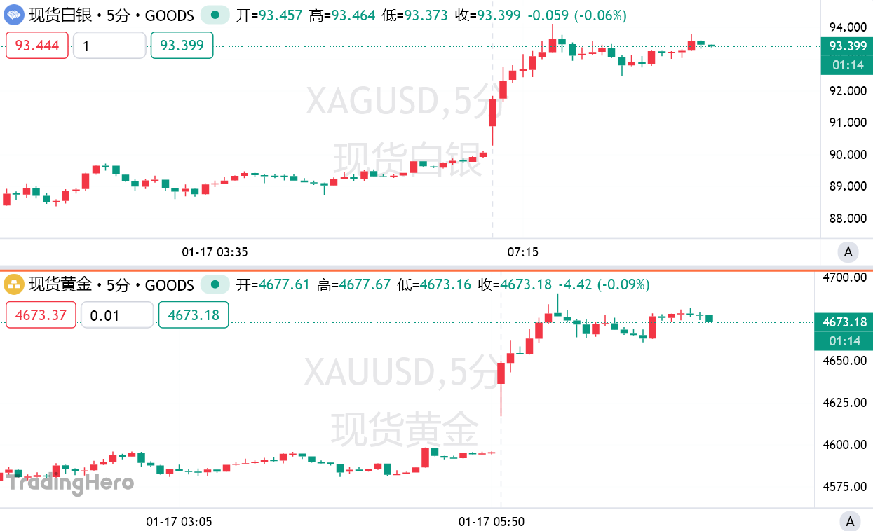 现货白银刷新历史新高至93.69美元/盎司,日内一度涨超4%。现货黄金盘中涨幅扩大至2%,报4690美元/盎司,亦创下新高。