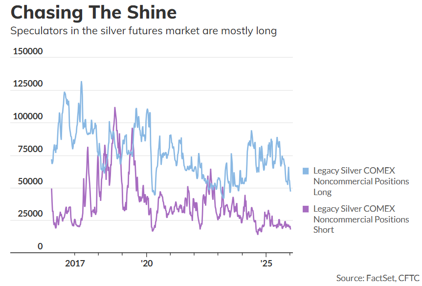 根据美国商品期货交易委员会(CFTC)发布的交易者头寸周度数据,期货市场的投机者绝大多数仍做多白银。与此同时,汇丰的斯蒂尔指出,空头头寸仍然明显偏低。