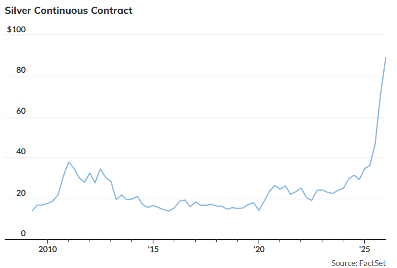 道琼斯市场数据显示,一场强劲的、由动能驱动的上涨在去年12月开始演变为抛物线式拉升,最活跃期货合约价格当月涨幅超过24%,创下自2020年7月以来的最大单月涨幅。这为2025年超过140%的涨幅画上句号,创造了有记录以来的最佳年度表现。