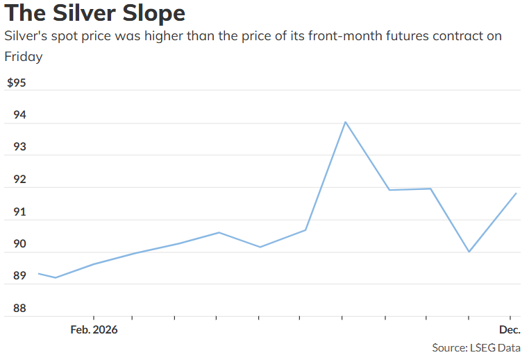 截至上周五,在实物金属中心伦敦交易的现货白银价格,略高于1月份到期的期货合约价格。金属期货在纽约交易,这里是全球金属衍生品市场的中心。