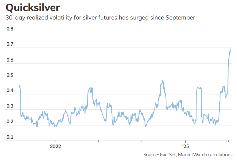 随着白银价格无情走高,该金属的每日波幅也在加大。