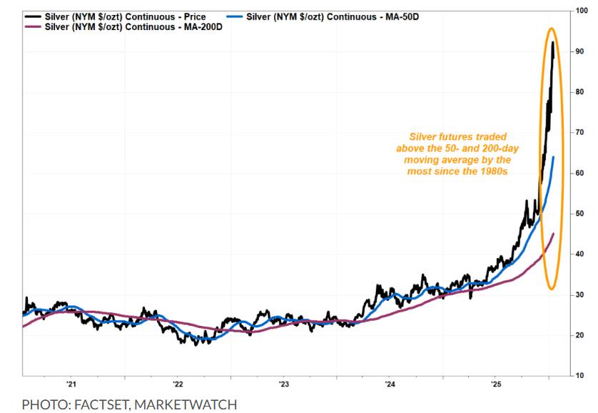 白银期货价格已经达到了自上世纪80年代以来从未见过的高于一些被广泛关注的趋势追踪指标的水平,这表明白银价格的涨势具有多么戏剧性的历史意义。