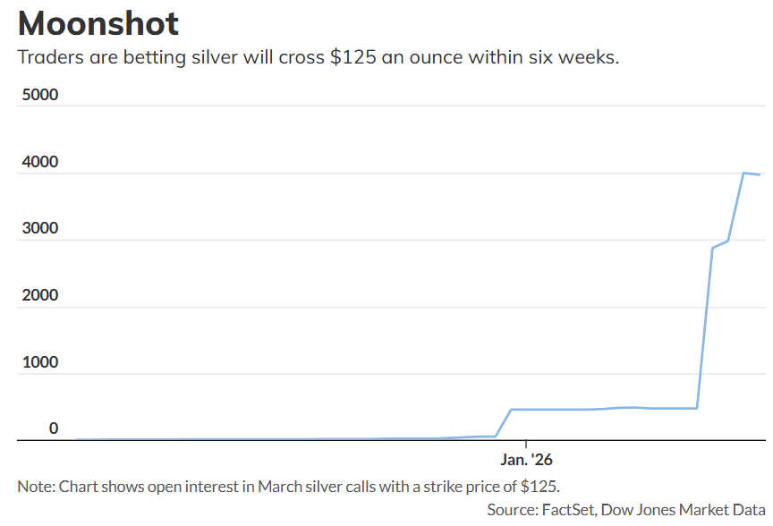 这并不一定意味着白银会在4月前达到125美元。汇丰的斯蒂尔表示,投机者极度看涨的迹象通常表明涨势可能即将出现回调。