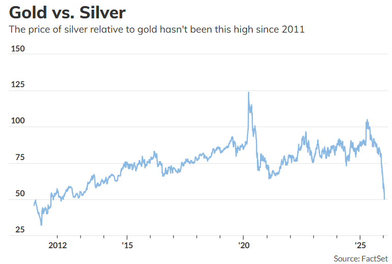 上图显示,在一年时间里,白银从相对于黄金非常便宜变得非常昂贵。