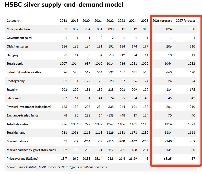根据汇丰的斯蒂尔的说法,白银供需失衡在2025年变得尤为严重,白银研究所的数据显示供应短缺了2.3亿盎司。