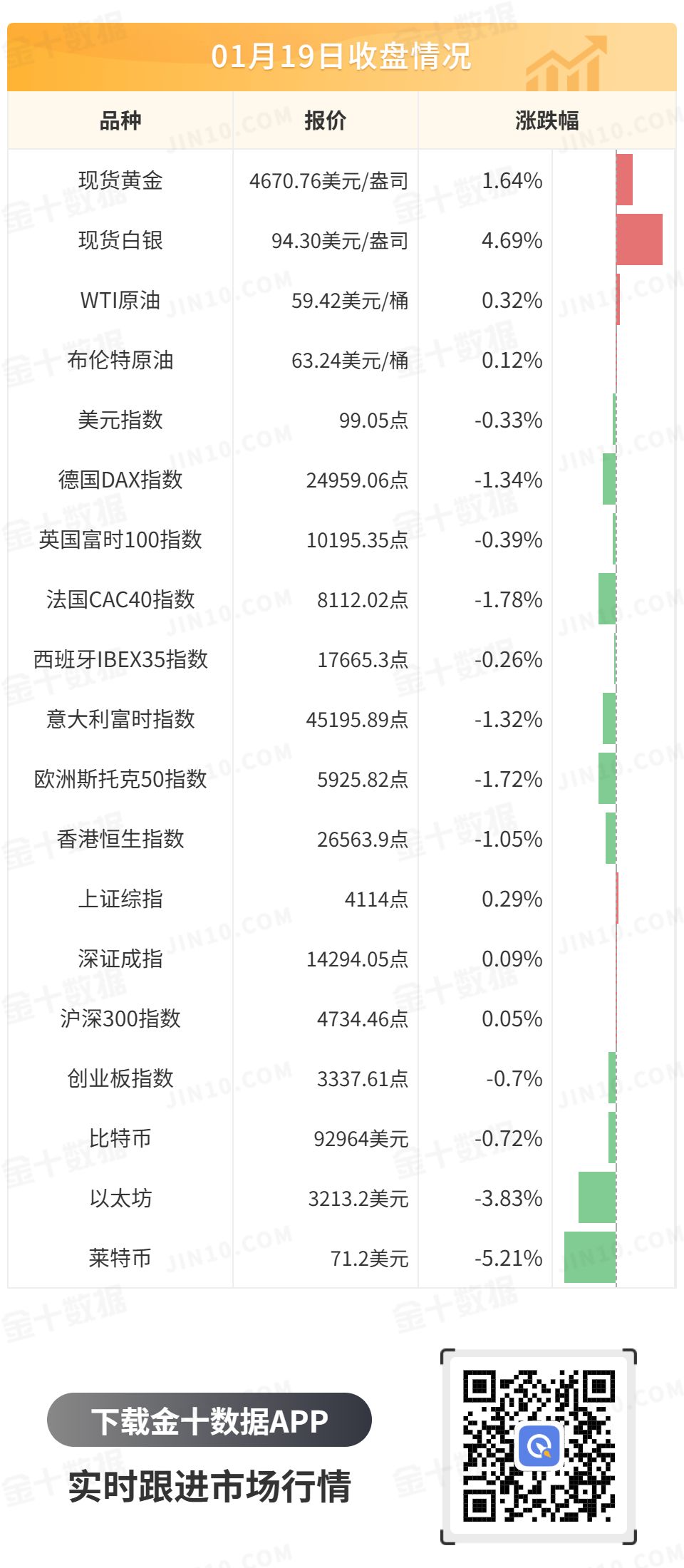 受助于避险需求,现货金银周一双双创下纪录新高,现货黄金一度触及4690美元,最终收涨1.64%,报4670.76美元/盎司;现货白银最终收涨4.69%,报94.30美元/盎司。
