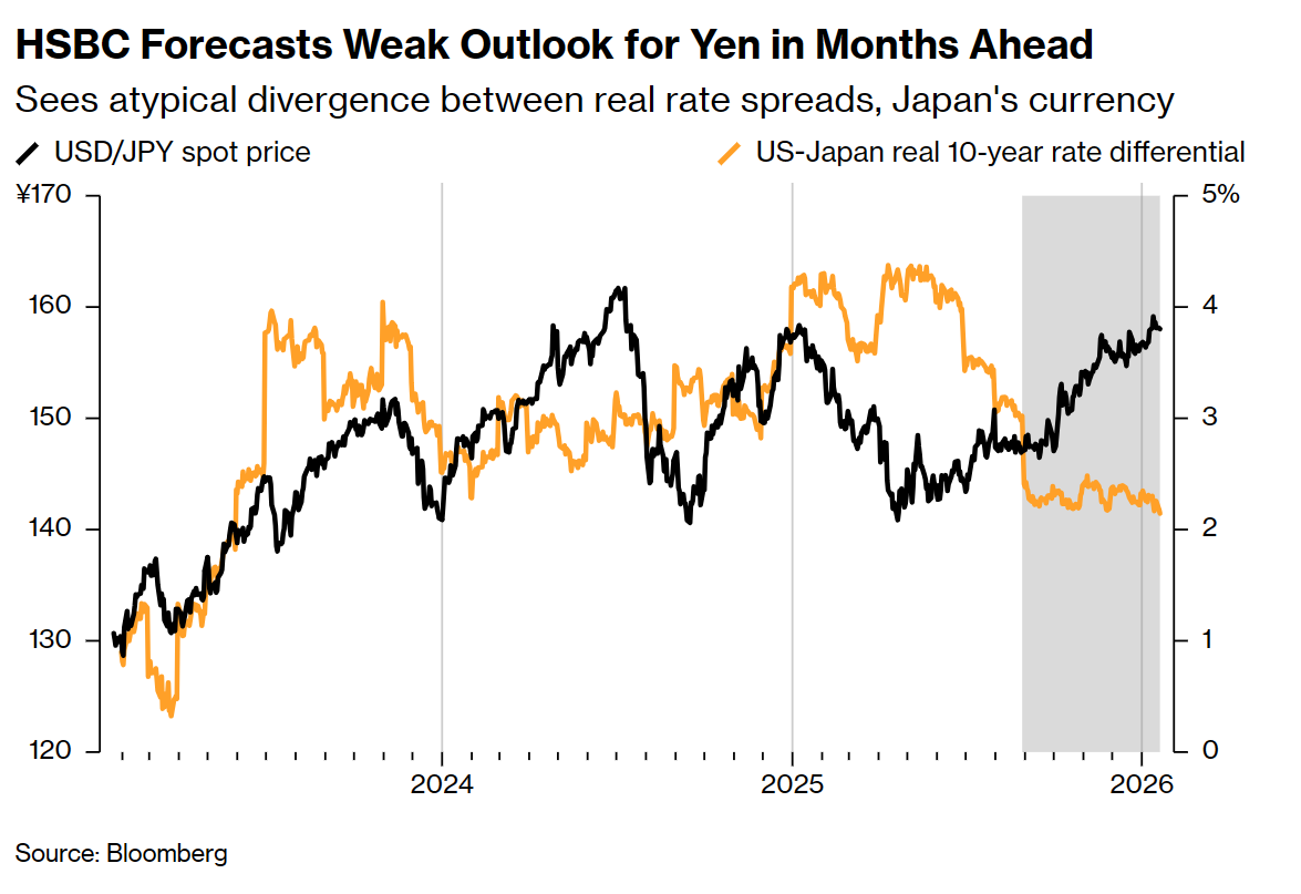 基于上述风险,汇丰现已修正预测,预计年中日元兑美元将跌至160大关,而非此前预测的升值至150水平。策略师同时警告,若日元跌破160,日本当局干预汇市的可能性将成为令局势更加复杂的变量。