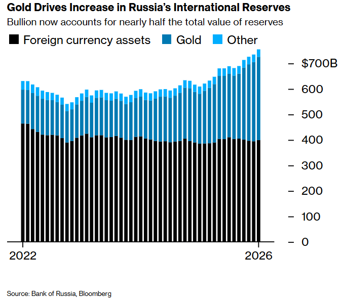 根据俄罗斯央行上周五公布的数据,截至去年底,俄罗斯的国际储备达到7550亿美元,其中包括价值3265亿美元的黄金。自那以来,金价已上涨超过8%,突破每盎司4700美元。