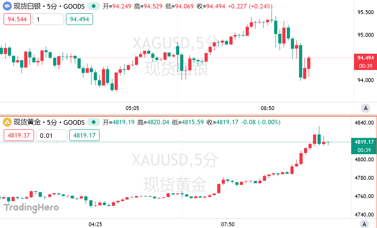 随着格陵兰岛危机的恶化和日本政府债券的崩溃支撑了避险需求,周三早盘现货黄金涨势不止,史上首次站上4800美元/盎司整数关口,随后持续刷新纪录高点,截至发稿报4819.75美元/盎司。与此同时,现货白银短线走低,一度跌破94美元/盎司。