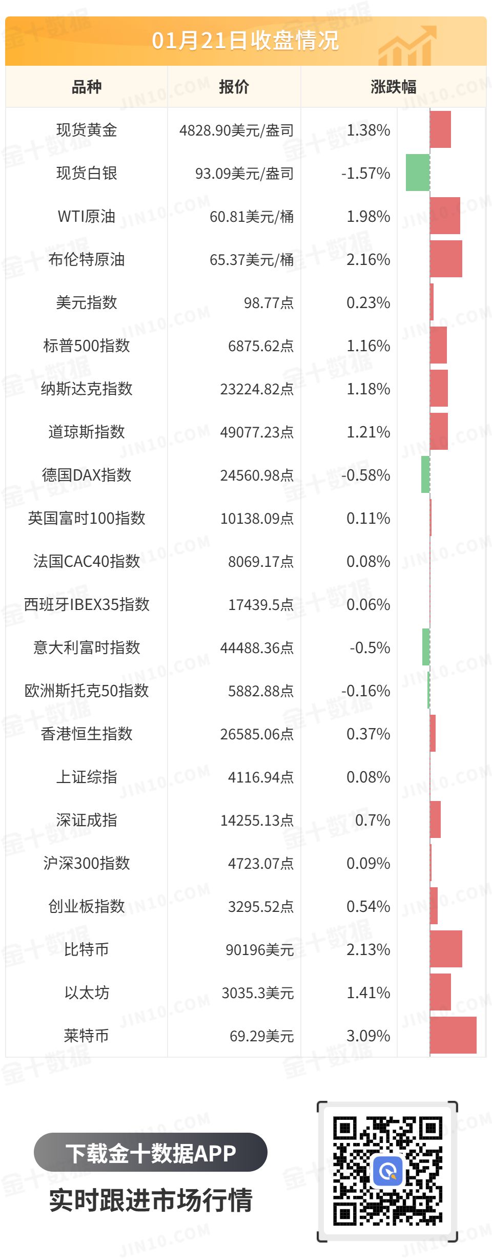 现货黄金延续周二涨势,但因特朗普透露格陵兰岛问题似乎迎来转机,黄金涨幅收窄,最终收涨1.38%,报4828.90美元/盎司;现货白银由涨转跌,最终收跌1.57%,报93.09美元/盎司。