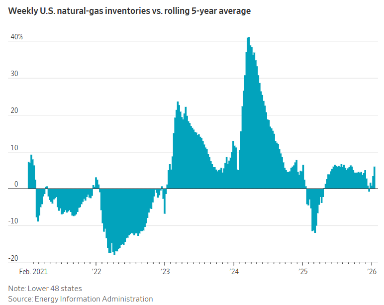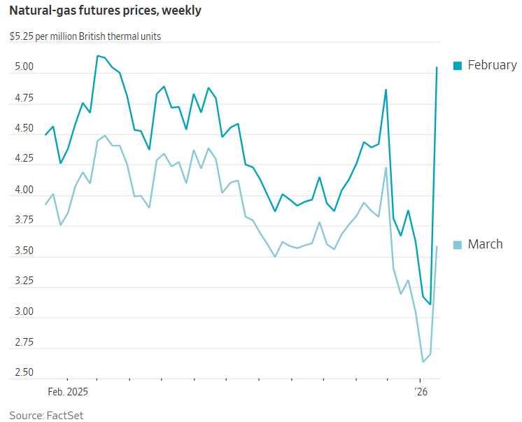 天然气价格涨幅最大的是近期交付的合约。作为取暖和发电燃料的二月交割期货合约,录得了有记录以来最大的三日百分比涨幅。周四,该期货结算价为每百万英热单位5.045美元,远高于上周五的3.103美元。