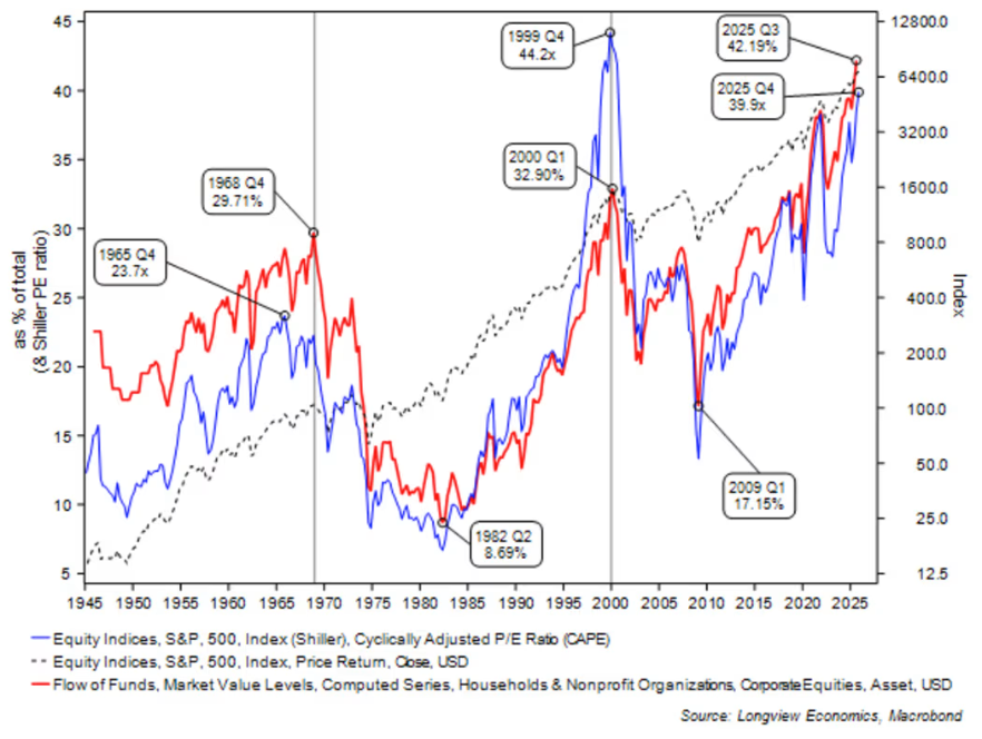 沃特林还展示了一份图表,图表显示,美国此前的历次长期熊市,均始于估值触顶与股票持有比例创纪录的双重背景。他指出,1968年和1999年,这两个指标均迎来峰值,随后的上世纪70年代和21世纪初,美股便进入了长期熊市。