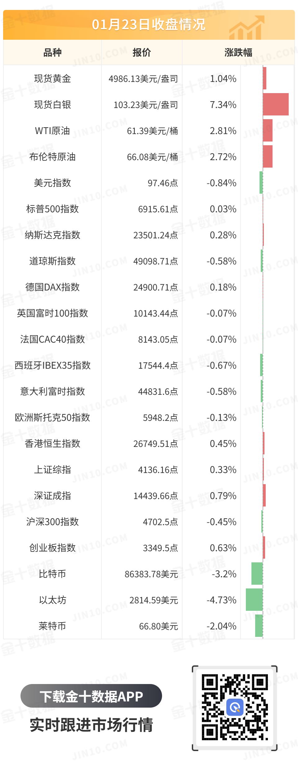 现货黄金再创新高,距离5000美元仅一步之遥,最终收涨1.04%,报4986.13美元/盎司;现货白银冲上100美元/盎司,最终大涨7.34%,报100.23美元/盎司。周一开盘,现货黄金冲上5020美元大关,白银一度冲上106美元。