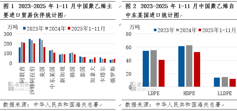 2023-2025年1-11月,中国聚乙烯自中东某国进口量维持在前四的位置,中东某国作为中国聚乙烯进口主要贸易伙伴之一,2025年1-11月,中国自中东某国进口量在105.03万吨,占聚乙烯进口总量的8.70%。其中LDPE进口量40.77万吨,占LDPE进口总量的14.10%,HDPE进口量52.33万吨,占HDPE进口总量的10.69%,LLDPE进口量11.92万吨,占LLDPE进口总量的2.78%。
