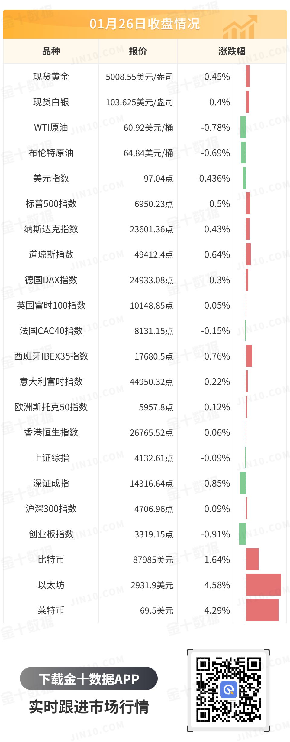 由于美元疲软增强了需求,贵金属价格再创新高,但随后剧烈波动回落。现货黄金盘中突破5100美元/盎司,美盘午后震荡走低跌破5000美元关口,最终收涨0.45%,报5008.55美元/盎司;现货白银盘中冲上117/盎司,日内一度暴涨14%,创全球金融危机以来最大盘中涨幅,随后自高位大幅回落,抹去日内所有涨幅转跌,最终收涨0.4%,报103.625美元/盎司。现货铂金下破2600美元/盎司,早前创下新高至2919美元/盎司,收跌7.23%,报2570.20美元/盎司。