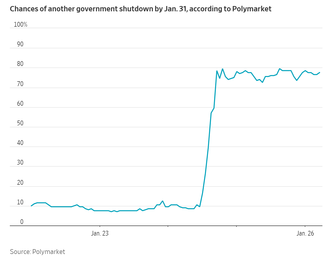 Polymarket的数据显示,截至周一,市场定价所隐含的一月底政府停摆概率已飙升至78%,而在上周五,这一数字还不足10%。目前,围绕该事件的博弈已吸引了约750万美元的交易量。