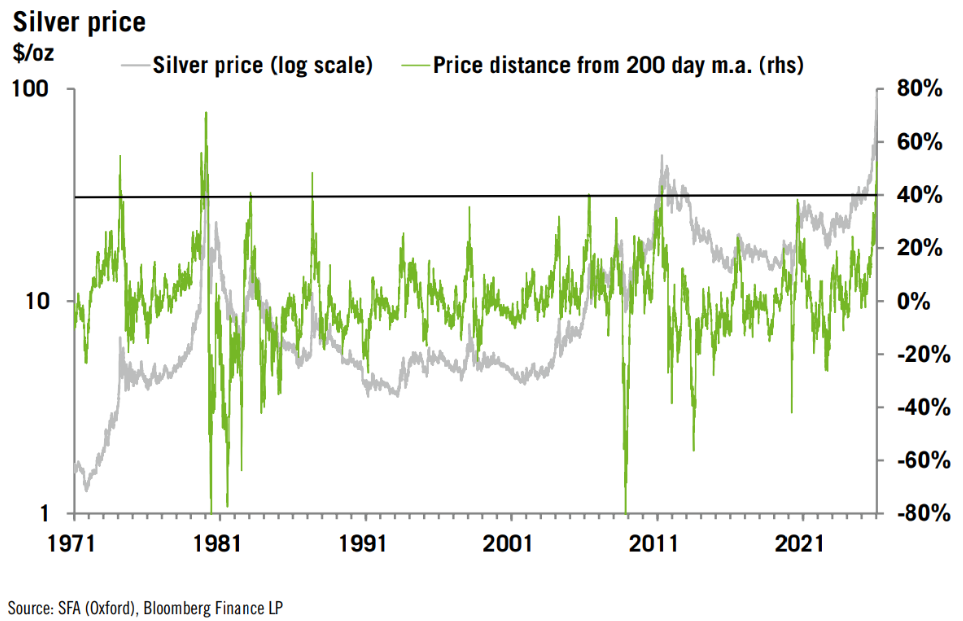 “本轮白银价格上涨已成为自1980年亨特兄弟试图逼仓市场以来最为极端的一次,”分析师指出。“在1月23日白银价格突破每盎司100美元时,其价格已高出200日移动均线54%。而在1980年,白银价格峰值曾高出其200日移动均线70%以上。在1974年,其价格也曾一度高出200日移动均线54%随后进入调整(峰谷跌幅达44%),但那轮涨势随后延续到了1980年。”