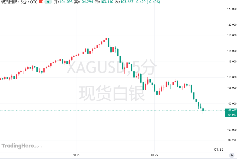 白银价格周一上演惊心动魄的倒V走势,现货白银盘中冲上117/盎司,日内一度暴涨14%,创全球金融危机以来最大盘中涨幅,随后自高位大幅回落,并在美盘末尾抹去日内所有涨幅转跌,最终仅收涨0.4%,报103.625美元/盎司。