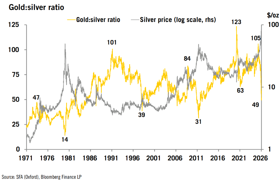 “从历史经验看,白银往往会在价格上涨的最后阶段跑赢黄金,”他们表示。“金银比率已从2025年4月的105降至上周49的低点,创下2013年以来的最低水平,尽管在此期间黄金价格仍在不断刷新历史高点。过去金银比率虽也曾数次低于当前水平,但很少在如此短时间内出现如此巨大的波动。”