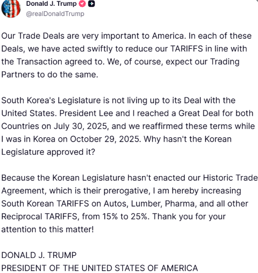 “韩国立法机构没有履行其与美国的协议,”特朗普在发文中称。“在每一项协议中,我们都迅速采取行动,按照达成的交易降低了我们的关税。我们当然也期望我们的贸易伙伴能这样做。”