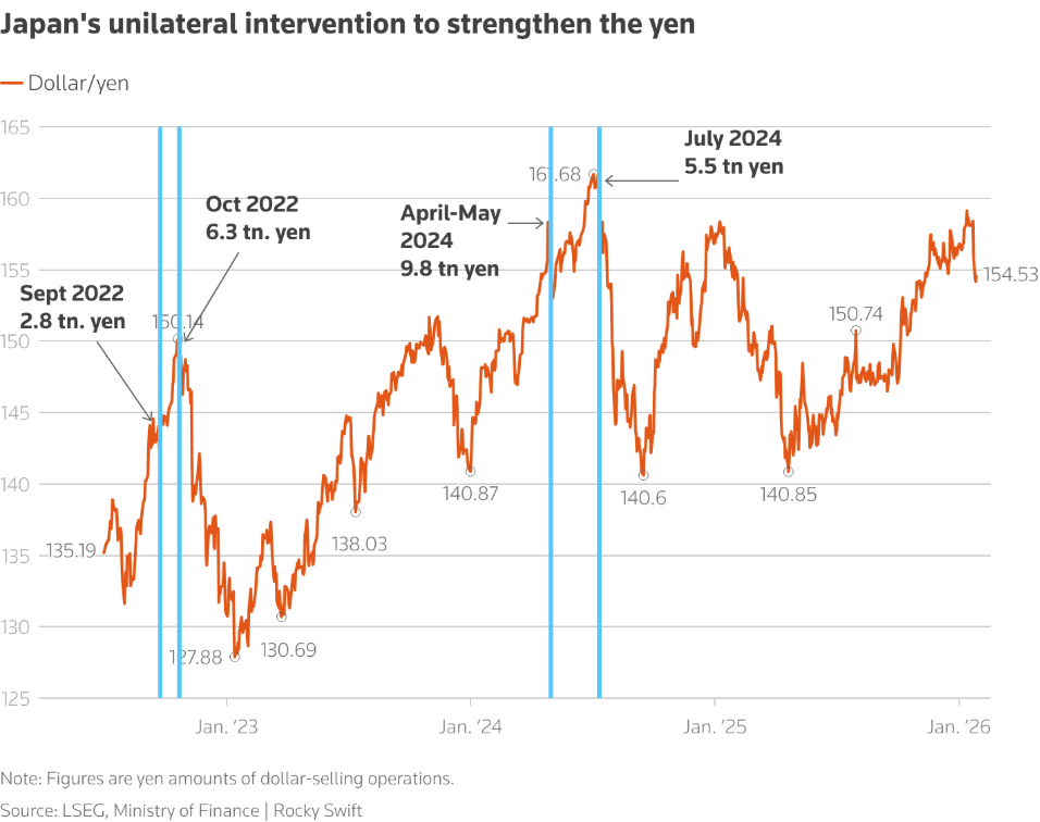 在大选临近的背景下,高市早苗根本无法承受日本市场出现跨资产类别的、自我强化式的“抛售日本”型暴跌。因此,即便日本央行释放鹰派信号,交易员仍在大举抛售日元,而在上周五,日元汇率突然大幅拉升,数小时后再度走高,这一走势似乎是日本央行和纽约联储联合开展汇率核查的结果。