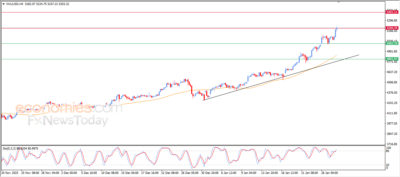 Economies.com的分析师今日最新观点:现货黄金价格在近期日内交易中延续涨势,持续刷新历史新高,并已触及我们此前分析中预期的5200美元阻力位目标。这一强劲表现受到价格持续运行于50日指数移动平均线(EMA50)上方的支撑,进一步巩固了短期内主导看涨趋势的稳定性。另一方面,相对强弱指标(RSI)持续为看涨路径提供利多信号。尽管指标目前处于超买区,可能引发价格波动或暂时性的获利了结,但这并不会动摇主导上升趋势的强度。因此,我们预计黄金在接下来的日内交易中将继续上行,若能有效突破5200美元阻力位,后市目标将看向下一阻力位5400美元。