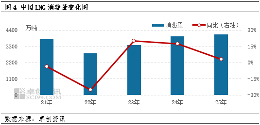 2025年,充足的管道气供应、温和的天气以及宏观环境的波动、液价的阶段性上探等因素交替牵制终端采购活跃度,下游多仅维持刚需采购且囤货需求寥寥无几,LNG消费量增速降至个位数。就季节性需求而言,年初、年末的极寒和年中的高温干旱等极端天气情况均较少,供暖用气、发电调峰需求与往年同期相比更为温和,加之管道气市场供应充足,冬夏两季城燃、气电厂等终端并未出现密集的LNG补库需求。而就常态化消费而言,在多数终端用户本就面临较大经营压力的基础上,一季度中期至二季度中期液价水平的抬升冲击了下游采购热情,尤其是在与管道气相比经济性下降的情况下,更多具备“双气源”条件的点供用户转而使用管道气;此外,国际贸易争端也使许多出口依赖度较高的终端行业出现了市场活跃度不足等现象。故据卓创资讯统计,2025年中国LNG消费量为4106.1万吨,与2024年相比仅增加了3.01%。