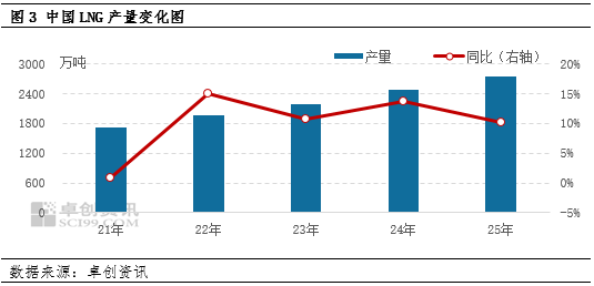 进入2025年后,LNG工厂生产持续获得了充裕的气源保障,尽管供应端获利状况愈发欠佳,但各地工厂扩能及新厂投运热情不减,产量维持10%以上的稳健增幅。上半年,接收站出货量的减少使国内LNG市场再度对工厂供应提出了更高的要求,故虽然微薄的利润空间抑制了部分工厂的生产运行热情,但整体来看,产量增势依然能够得以维系;下半年,新产能的加入为LNG生产领域注入了更多活力,即使是进入供暖季后,各地气源亦未因管道气保供而出现显著缩减情况,这一点在年尾中石油直供工厂原料气竞拍投放量的连续增加现象中可窥一斑,丰足的气源成为了巩固LNG产量增势的关键。据卓创资讯统计,2025年中国LNG产量为2745.84万吨,与2024年相比增加了10.23%;其在国内LNG总供应中的占比约为66.87%,同比提升了4.38个百分点。