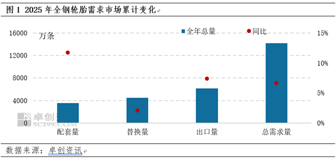 轮胎需求方面,卓创资讯认为2026年全钢轮胎需求量亦存一定的增长空间,但增幅较上年收窄。首先,配套市场仍为需求增长的主要带动。新能源商用车渗透率持续提升,以及国以旧换新等政策的持续发力,为配套市场注入增长动力。但是2025年商用车产量同比增幅达12%,高基数效应下,2026年商用车产销将回归理性增长,预计全年产量同比增长回落至4%-5%,对整体需求增幅形成明显拖累。替换市场呈现弱修复态势,显著增量力度有限。货车保有量持续增加,叠加基建投资平稳增长或带动轮胎替换需求改善。但货运市场运力过剩局面依然存在,加之房地产投资低位徘徊,对替换需求的拉动不足,导致替换市场修复节奏缓慢。出口市场仍是需求增长的关键支撑,但高基数与贸易壁垒的承压下,2026年出口增量动能或减弱。
