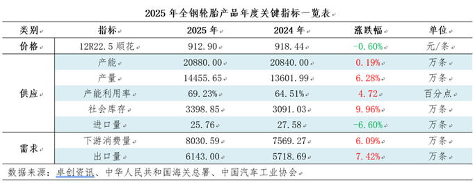2025年国内经济稳步复苏,在新的产销环境下中国全钢轮胎产量显著提升,以充足的产能供应,有效匹配国内及国际需求的较强增长。商用车产量持续走高、替换市场刚需逐步修复,叠加海外需求的可观增量,共同推动轮胎市场需求的扩容。与此同时,随着原材料价格高位回落后区间震荡,轮胎行业盈利空间得以修复。