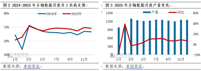 2025年轮胎市场开工负荷变化符合“假期扰动-复工冲高-高位回落-维持盘整”的周期性规律。下半年开工高于去年同期成为全年亮点,全年产能利用率提升4.72个百分点,全年产量同比增幅6.28%。具体来看,今年春节假期贯穿1月下旬至2月初,节前轮胎企业库存充足削弱了补库动力,叠加终端需求疲软,1月轮胎开工负荷降至年内最低。节后市场逐步复工复产,叠加经销商阶段性补库需求,轮胎开工持续回升,3月全钢轮胎开工提升至71.99%,产量提升至年内高位水平,达到1297.65万套。二三季度,国内替换市场需求增量压力犹存,然配套及出口市场对轮胎产销形成较强支撑,成为月度开工高于去年同期的核心动力,且月度产量同比均实现正增长,其中8月产量增幅达到11.45%。四季度随着海外备货周期结束,出口量逐步回落。叠加国内替换市场传统淡季持续显现,轮胎开工有所放缓。