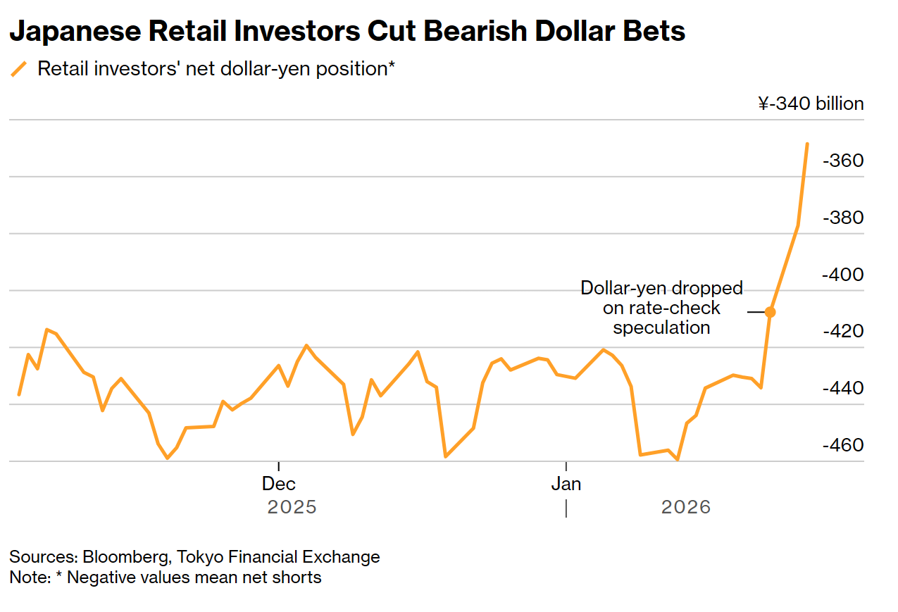 用更通俗的话说,持有“美元空头”意味着押注日元会升值。而根据彭博社的数据分析,散户在短短三天内如此大规模地削减这些看涨日元的押注,创下了自2022年10月以来的最高纪录。