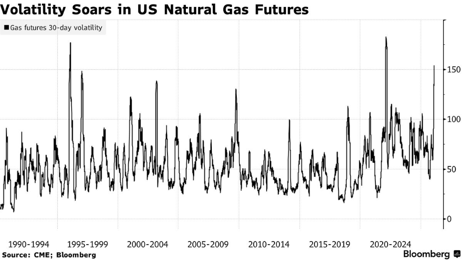 天然气市场的一项波动率指标已升至2022年2月初以来的最高水平,彼时寒潮同样席卷美国大部,部分投资者也陷入了需求激增、供应受阻的类似困境。在此之前,天然气期货市场自1996年起便未经历过如此剧烈的波动。