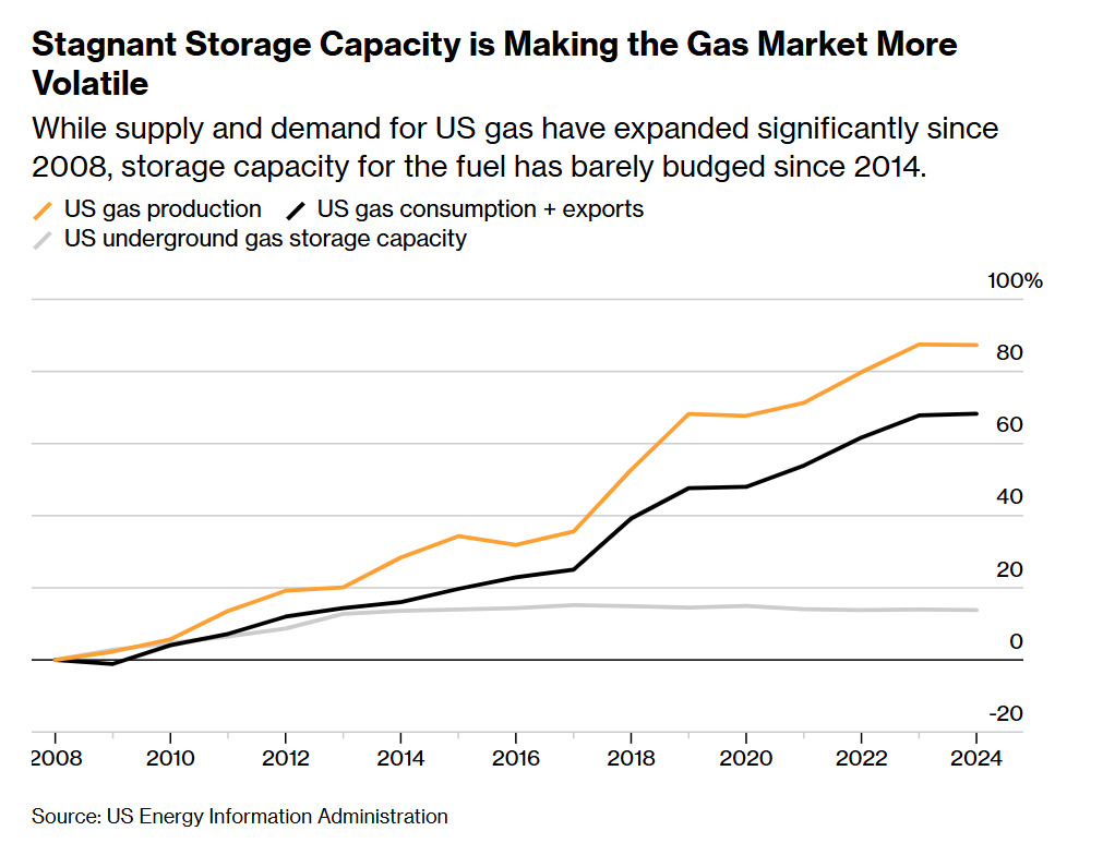天然气市场波动率攀升的另一大原因是新增储气设施短缺,而当天然气需求超过管道运输能力时,储气设施是缓解供应短缺的关键。