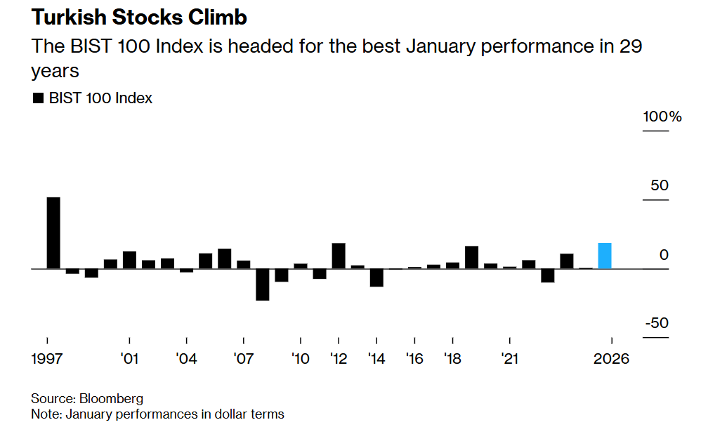 受益于新兴市场乐观情绪蔓延及自身估值优势,外国投资者重新涌入土耳其股市,推动该国股市有望创下1997年以来的最佳1月表现。