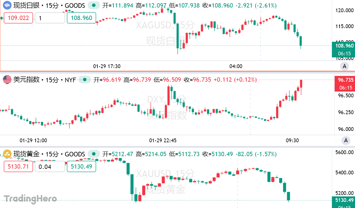 华尔街周四经历了一个疯狂交易日,贵金属价格飙升后暴跌,油价大涨,股市多空双方则陷入激烈拉锯。周五亚盘波动未停止,截至发稿现货黄金日内重挫逾230美元,失守5140美元/盎司,日内跌幅4.3%。现货白银日内重挫逾6美元,现报108.9美元/盎司,跌幅近6%。