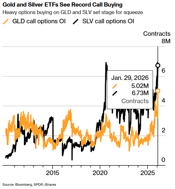 在一些投资者看来,期权是押注市场上涨的廉价方式。推动此前散户白银购买潮的Reddit群组帖子显示,通过押注白银快速上涨可获得超过1000%的收益。最近几周,最大的黄金和白银ETF均出现了看涨期权的创纪录未平仓合约和交易量,SLV的看涨期权成交量甚至超过了跟踪纳斯达克100科技股指数的基准ETF。