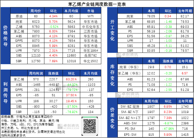 [导语]本周苯乙烯产业链均价除乙烯小跌外,其他均表现为上涨。其中苯乙烯和橡胶涨幅较大,苯乙烯基于原油偏强及板块共振价格涨幅放大,利润得以改善,橡胶因其他原料丁二烯也上涨,利润亏损进一步加剧。后市来看,原油是否继续偏强存不确定性,苯乙烯供应端紧张和需求端出口持续成交也暂时出现变故,利好情绪有所缓和,价格短期有所回调,但非趋势性,还需继续关注原油及节后市场变化。