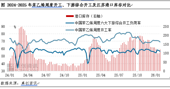 1月苯乙烯华东港口库存呈现出先去后累的趋势,最后一周到货增多,也主要是为赶纸货交割期。即将进入2月,根据目前了解下周主港到货较少,预计数量0.9万吨,库存或有再次下降预期。2月整体到船数量或与1月相对持平,春节后常规存累库预期,但累库力度或较去年略弱,叠加前期苯乙烯上涨时,苯乙烯-纯苯价差不断走扩,期货与纸货市场或空头较多,对2月价格存一定支撑。但也需警惕2月连云港仓单及今日新阳计划重启的一套30万吨/年装置带给港口的到货增量。且下游ABS亏损力度进一步扩大,2月存在石化厂减负消息,较前期下游在预售订单下尚能维持高开工的预期有所调整。