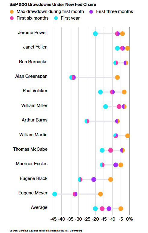 根据巴克莱汇编的数据,自1930年以来,在新任美联储主席走马上任后,标普500指数在一个月、三个月和六个月期间的平均回撤幅度分别达到5%、12%和16%。这些跌幅超过了该指数在任意随机选取的年份中的典型峰值至谷底的回调幅度。