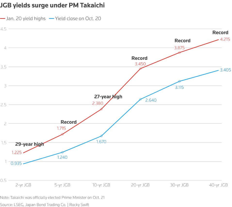 自去年10月高市早苗赢得自民党总裁以来,日本国债收益率已飙升至历史峰值。高市早苗是一名财政鸽派,也是前首相安倍晋三“安倍经济学”的追随者。