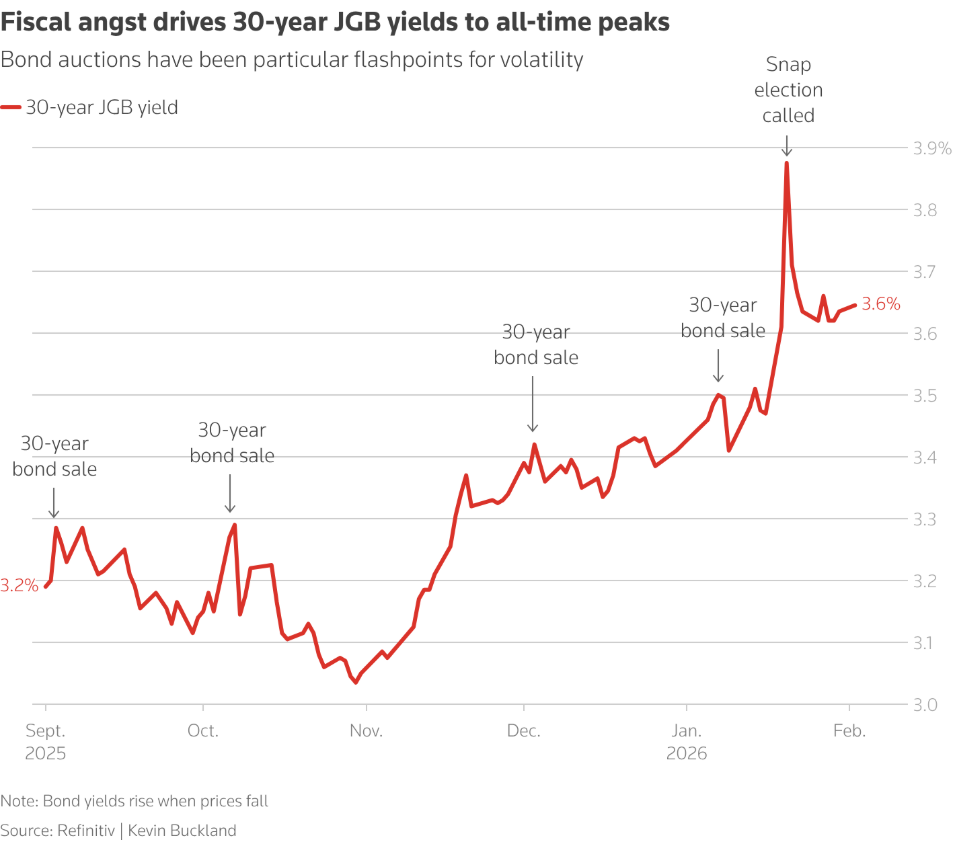 1月20日,在高市早苗宣布解散议会举行大选,并承诺暂停食品税两年却未说明如何填补约10万亿日元的收入缺口后,30年期日本国债收益率一度飙升至3.88%的历史高点。