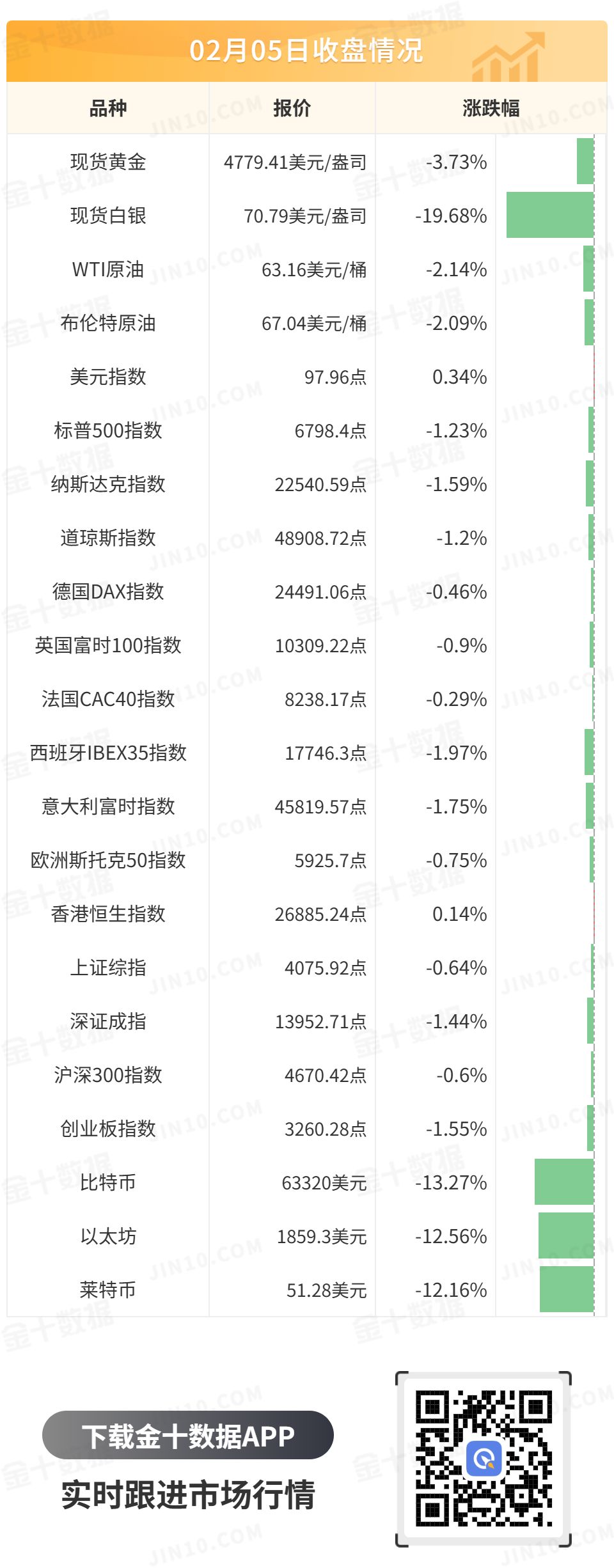 贵金属遭重挫,现货黄金开盘后急速下跌,并一度失守4800美元,随后又反弹超100美元,但在美盘时段金价继续震荡下跌,再度跌破4800大关,最终收跌3.73%,报4779.41美元/盎司;现货白银在亚盘时段一度重挫10美元,随后陷入震荡,但在美盘时段继续扩大跌幅,并跌至70美元关口附近,最终收跌19.68%,报70.79美元/盎司。