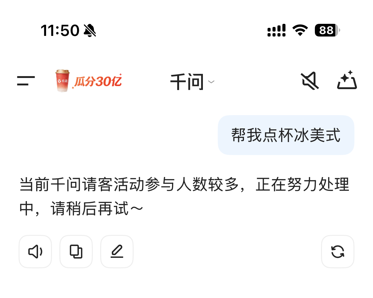 2月6日,阿里巴巴(BABA.N)旗下AI应用千问推出“春节30亿免单”活动,但很快出现大批用户反馈系统卡顿和无法参与的情况,活动页面频繁显示“系统开小差,请稍后再试”等提示,影响了用户完整参与体验。