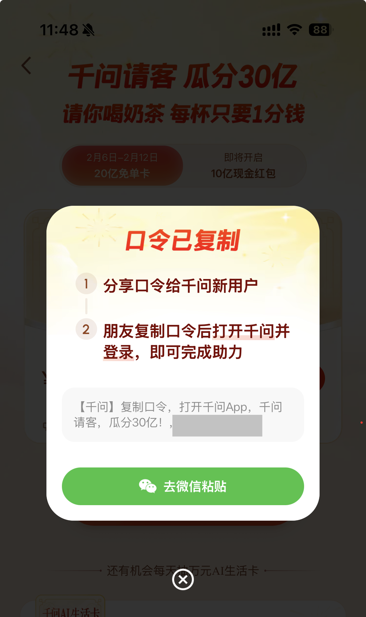 在技术问题之外,千问活动在传播路径上也遭遇阻碍。目前千问的红包分享链接在微信内被屏蔽,微信客户端提示网页内容可能含有“诱导或误导下载/跳转”的信息,导致用户必须通过第三方浏览器访问活动页面。此外,一些用户在尝试分享活动至微信好友时,分享方式已自动变更为复制口令形式。